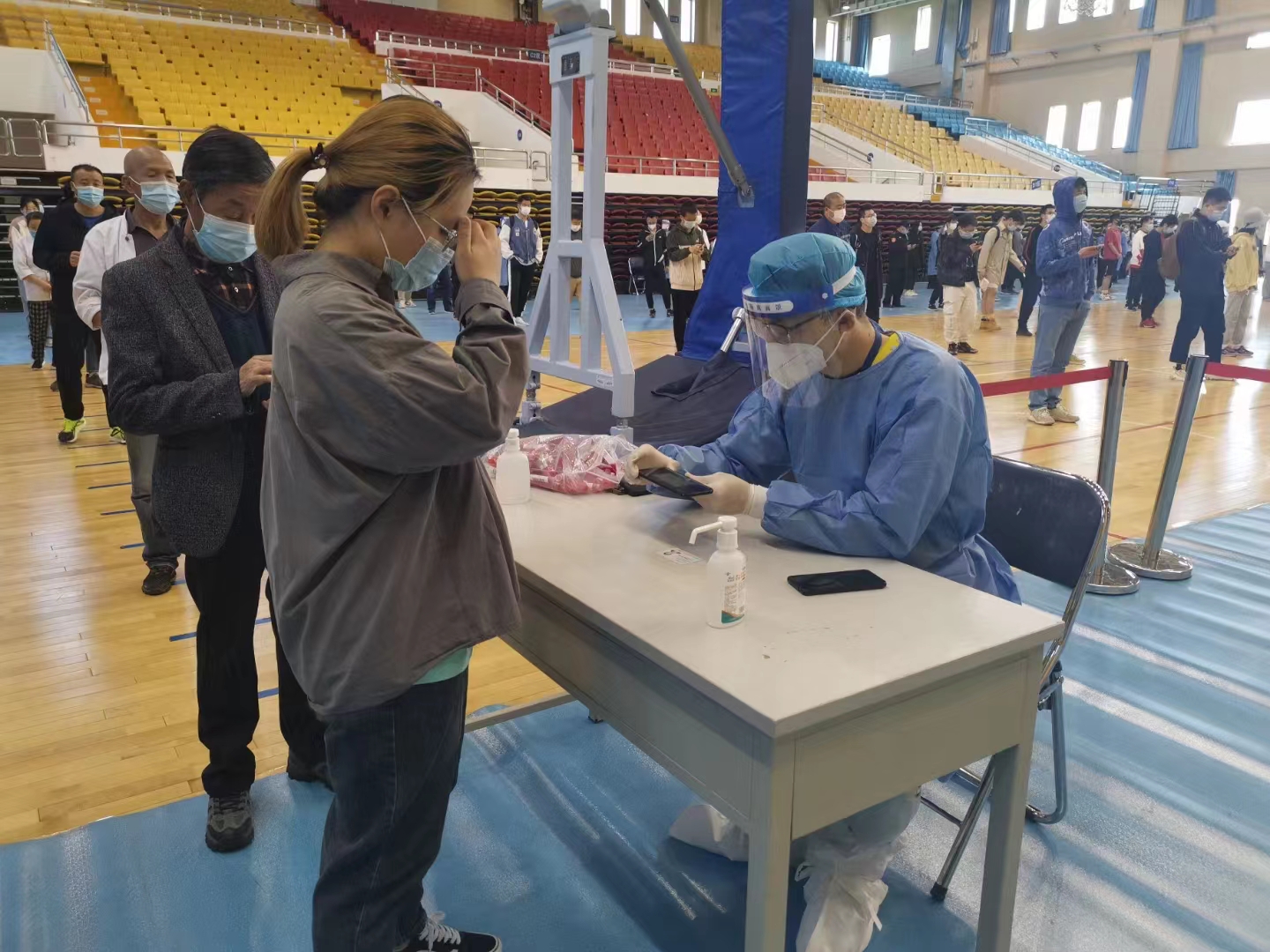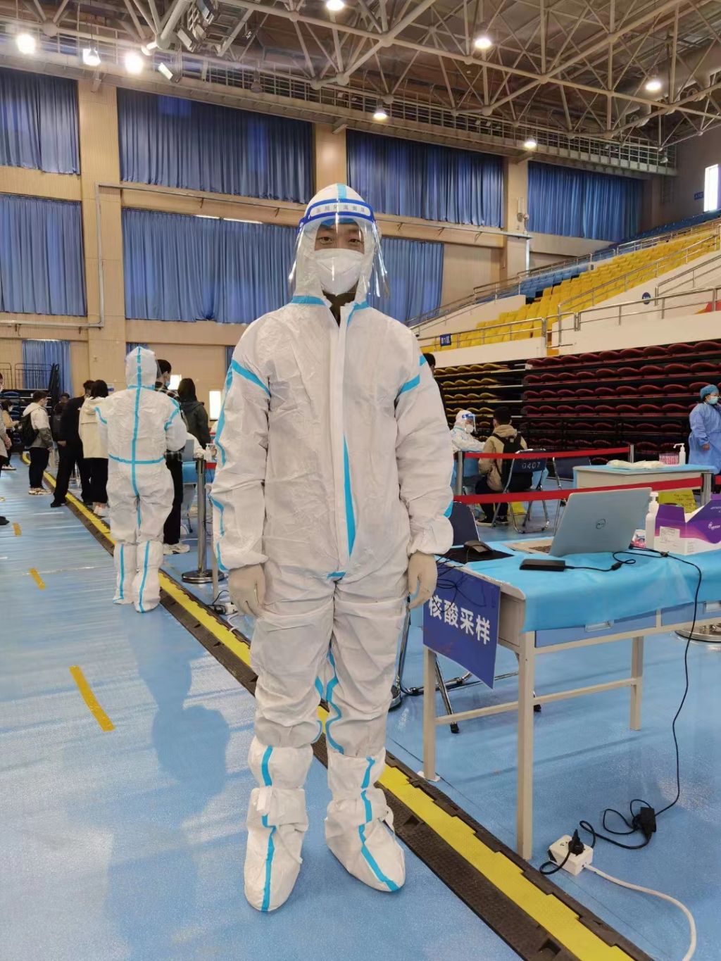 惟其艰难,更显勇毅!4月5日深夜上级紧急通知第二天开展全员核酸检测,然而检测人员严重不足,时间紧任务重。学院分子系系主任高龙成老师了解到实际情况后,主动请缨报名了志愿者,经过现场培训,第二天一早就出现在了检测现场,保障了核酸检测任务的顺利进行,体现出一名教师的使命担当。截至目前,学院已有20余名教职工参加了防疫志愿服务工作。每天在志愿者工作群里,仍有源源不断的教职工主动请缨。征集志愿者的通知一出,即使是在深夜11点,10分钟队伍就能集结完毕,真正的“一岗难求”。他们当中,既有刚刚参加工作的青年教师,也有即将退休的老教授,在抗“疫”一线,他们都是勇毅的战士。刚入职一个月的青年教师李老师穿着厚重防护服、罩着防护面具、戴着N95口罩的“大白”在岗位上一丝不苟地忙碌着,“下一位同学,扫一下身份证,好的,可以啦”。学院工会主席郑咏梅教授在完成核酸信息采集工作后,脱下厚重的防护服,衣服、头发都已湿透,脸上也勒出了深深的口罩痕迹。她说到“只有穿过防护服,才知道那些奋战在疫情防控一线的医护人员多么辛苦,感谢她们的付出。