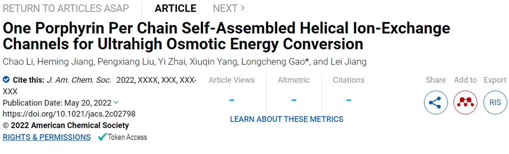 2022年5月20日,Journal of the American Chemical Society 在线发表了我院江雷院士、高龙成副教授团队在高效离子交换膜方面的最新研究成果:“One Porphyrin Per Chain Self-Assembled Helical Ion-Exchange Channels for Ultrahigh Osmotic Energy Conversion”。Beat365唯一官方网站博士生李超为第一作者,高龙成副教授为通讯作者,Beat365唯一官方网站为第一单位。