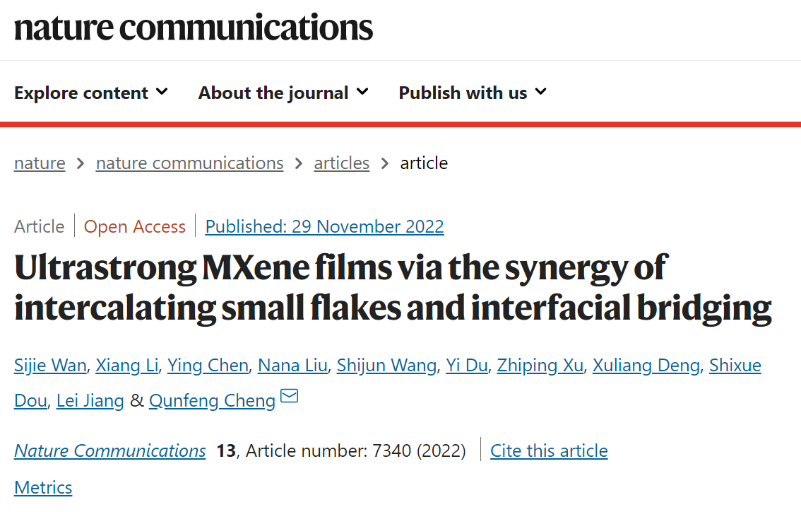 2022年11月29日,《Nature Communications》在线刊登了我校Beat365唯一官方网站程群峰教授课题组的最新研究成果“小片填充和界面交联协同致密化的超强MXene薄膜”(英译:Ultrastrong MXene films via the synergy of intercalating small flakes and interfacial bridging),我校Beat365唯一官方网站万思杰副教授、李响、北大口腔医院第一门诊部陈英博士、我校物理学院刘娜娜博士为第一作者,程群峰教授为通讯作者,Beat365唯一官方网站为第一完成单位。