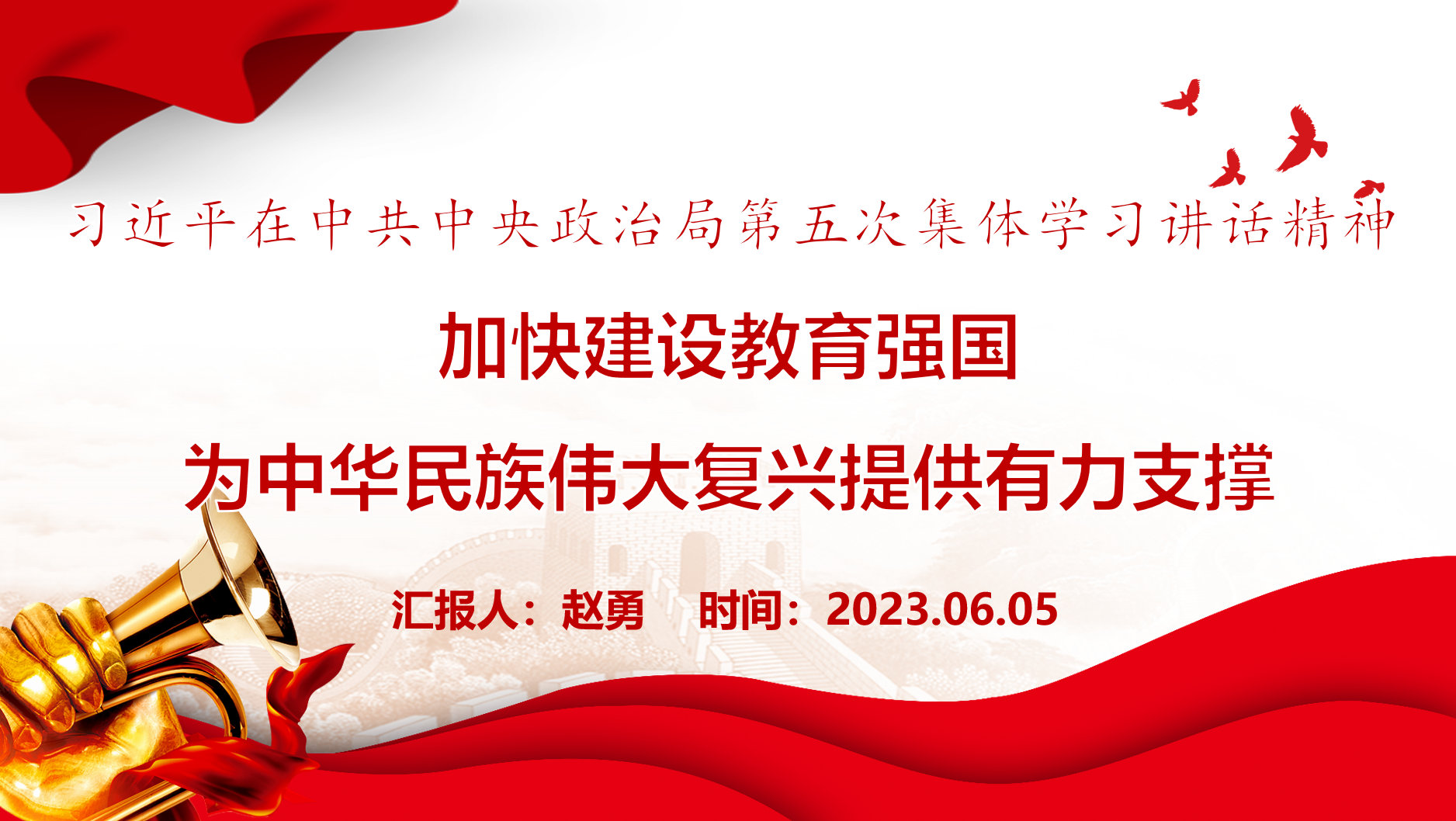 会上,党委委员赵勇围绕习近平在中共中央政治局第五次集体学习讲话精神,结合习近平总书记在北京育英学校考察时的重要讲话精神和浙江千万工程经验案例展开领学。他表示,建设教育强国是全党全社会的共同任务,要坚持和加强党对教育工作的全面领导。全党全国人民要坚定信心、久久为功,为早日实现教育强国目标而共同努力。广大教师要牢记为党育人、为国育才的初心使命,以人民教育家为榜样,以德立身、以德立学、以德施教。浙江“千万工程”经验,对推动学习贯彻习近平新时代中国特色社会主义思想走深走实,完成艰巨繁重的改革发展稳定任务,具有特殊重要意义。