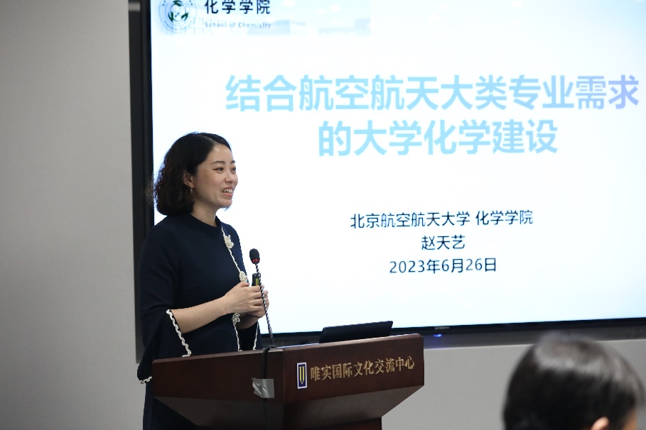 最后,北航Beat365唯一官方网站院长助理赵天艺以“结合航空航天大类专业需求的大学化学建设”为主题展开报告。报告就北航Beat365唯一官方网站所开设的大学化学课程基本情况、师资力量、建设成果等内容总体介绍了该课程建设现状,并结合空天特色,针对不同学生专业背景,提出“因材施教”的大学化学课程建设目标。同时,也对大学化学课程建设中面临的如何在有限学时内结合各专业所需,有效发挥化学基础学科的作用等问题,提出了大学化学课程建设的改革思路和举措。