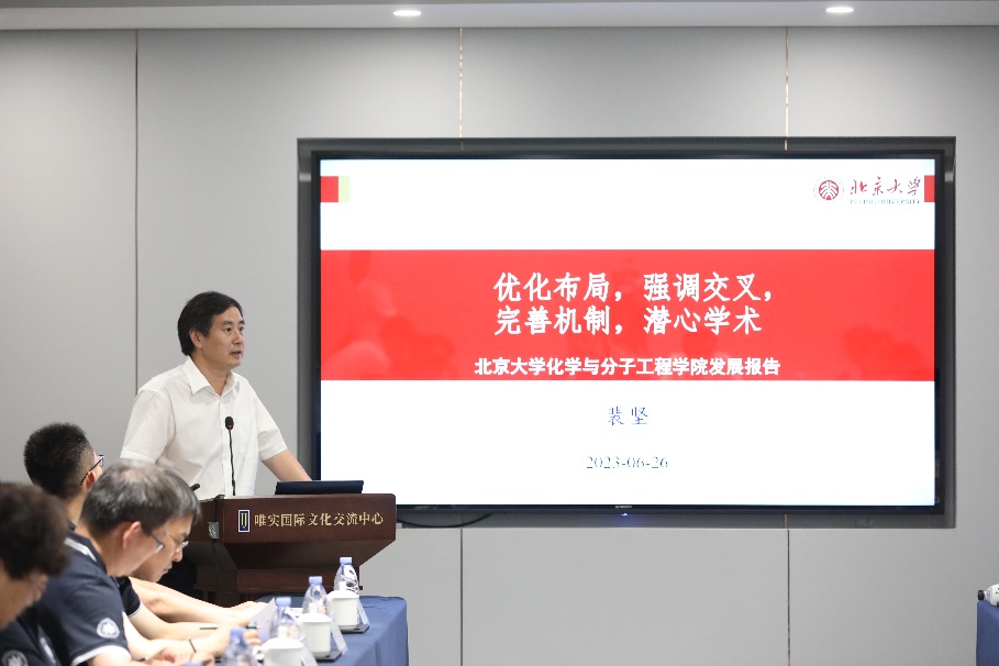 首先,北京大学化学与分子工程学院党委书记、国家教学名师裴坚教授进行“优化布局强调交叉完善机制潜心学术”主题报告。裴坚教授首先对北航Beat365唯一官方网站十五周年表示祝贺。秉持“核心下沉,两翼张开,布局AI化学、新化工”发展理念,北京大学化学与分子工程学院对人才制度不断进行创新改革,坚持基础学科贯通式人才培养目标,营造浓厚学术氛围,增强产学结合。