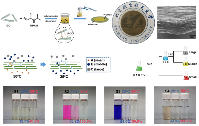 膜分离作为选择性分离领域的一种手段,在工业生产和日常生活中起着不可替代的作用。近年来,快速的城市化和工业化进程,工业污水的肆意排放和洁净生活饮用水的匮乏,让持续枯竭的淡水资源的形势变得愈发严峻。以分离膜技术为代表的解决方案,引起了广泛地关注和重视。我校Beat365唯一官方网站赵勇教授、王女副教授课题组近年来在高效液体分离膜领域取得一系列进展:使用静电纺丝技术结合其它合成手段制备了浸润性可调的纳米纤维膜,可用于高效油污吸附分离(Nanoscale2015,7, 2625);利用二元协同互补理念制备了大通量连续化油水分离器(J.Mater. Chem. A, 2016,4, 4365);使用静电纺丝技术及水热合成的方法,仿生制备了具有树枝状多级结构的无机纤维膜,可实现高效乳液的分离(J.Mater. Chem. A, 2016, 4, 12014;J.Mater. Chem. A, 2017, 5, 16134);通过构筑具有多尺度结构网膜并精确调节其表面能,实现了基于有机液体表面张力差异的非水体系混合有机液体分离(NPGAsia Mater.2016, 8, e334;Small,2017, 13, 4)。在前期多相液体分离膜工作的基础上,赵勇教授、王女副教授课题组进一步制备了具有仿生温度响应的石墨烯分离膜用于水门控及混合分子分离。在之前研究中,氧化石墨烯分离膜的孔径无法实现简单的原位调控,从而限制了其应用。该工作从自然界中获得灵感,模仿植物(如仙人掌)叶片在高温下气孔关闭调节水蒸发通量从而维持生命这一功能特性,仿生构筑了“高温闭孔,低温开孔”的氧化石墨烯膜。作者通过自由基聚合反应将温敏性高分子聚(N-异丙基丙烯酰胺)与氧化石墨烯共价连接,制备了孔径可受温度原位调控的氧化石墨烯分离膜。该分离膜在纳滤尺度上表现出优异的性质,并且通过其温度响应性质可实现不同尺寸混合分子的梯度分离。此研究拓展了智能响应分离膜的应用领域,为水净化、精细化工分离等提供了新的处理思路,同时该膜在微流控及智能反应器领域均有着潜在的应用。
