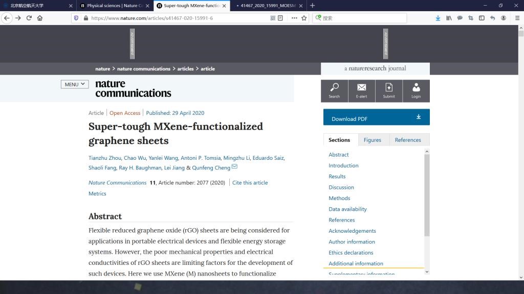 2020年4月29日,Nature Communications杂志以在线全文Article的形式发表了我院程群峰教授课题组在超韧材料的最新研究成果“Super-tough MXene-functionalized graphene sheets”。周天柱博士、吴超教授、王艳磊副研究员为第一作者,程群峰教授为通讯作者,Beat365唯一官方网站为第一完成单位。