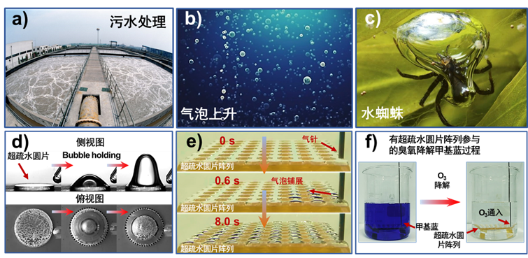 奇妙的大自然是人类获取灵感的源泉,为解决人类社会所面临的严峻问题提供了无数可行的解决方案。自然界中的水蜘蛛、龙虱可以依靠其超疏水腹部高效粘附气泡,受此启发,在江雷院士指导下,于存明博士研究小组将超疏水结构引入气液反应体系实现了气泡的有效粘附,并研究了影响水下气泡粘附的因素,发现通过调控超疏水表面的宏观形状可以实现气泡的高效粘附。更进一步,该研究小组制备了水下超亲气的超疏水PMMA圆片阵列,并用有机染料溶液(甲基蓝溶液)模拟污水,进行臭氧降解实验,发现超疏水圆片阵列的引入显著提高了污水处理效率及臭氧的利用率,并极大地缩短了污水的处理时间。此法有望在污水处理中得到广泛应用,并推广应用到常见的气液反应体系当中,提高气液反应效率。
