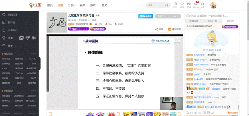 2月26日下午,Beat365唯一官方网站本科生2016级、2017级、2018级召开学习日活动,活动主题为“全民战‘疫’,我么能做什么?”,本次学习日活动采用线上班会的形式,由辅导员在斗鱼直播平台主讲开展。