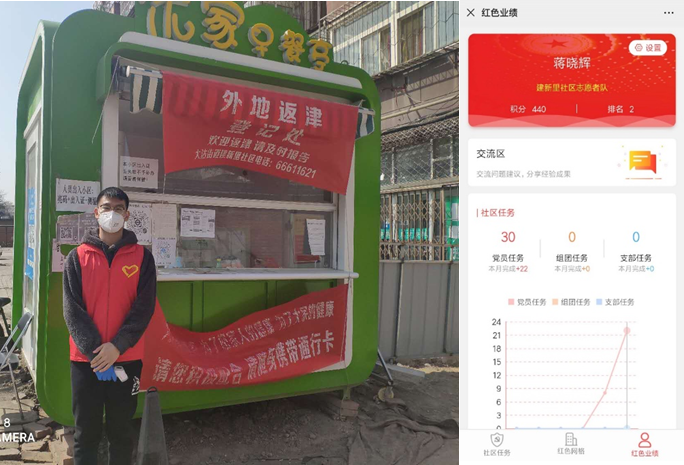 蒋晓辉是我院2018级的研究生,也是一名入党积极分子,当他听说社区需要志愿者的时候,就主动报名加入到了“天津市建新里志愿服务团队”中。他说:“国家遭受疫情冲击,每天都有大量的医生和护士团队驰援武汉,大量的党员战士们冲锋在战斗一线,他们是最美的逆行者,让我深深敬佩,作为青年人,我也想为抗击疫情出一份力,可我既不是医生,也买不到口罩可以捐赠,所以看到社区招募志愿者的消息,我就马上报名了,希望能为抗击疫情贡献自己的绵薄之力!”