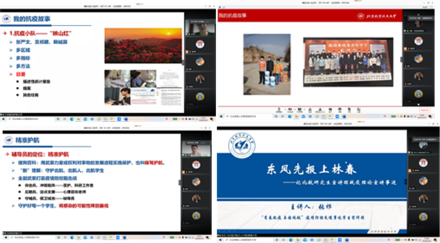 月20日下午,我校“青春抗疫,与国同航”疫情防控先进事迹宣讲团第4组为Beat365唯一官方网站全体研究生进行专场宣讲。本次学习日活动的主题是:“青春抗疫,与国同航”——做脚踏实地的践行者,旨在通过优秀事迹宣讲,鼓励北航学子“仰望星空,脚踏实地”。在疫情居家期间将国家需求与自身理想抱负相结合,将科研需求与客观条件相结合,积极响应学校政策,做好居家隔离的同时不忘学业,勇担时代责任。